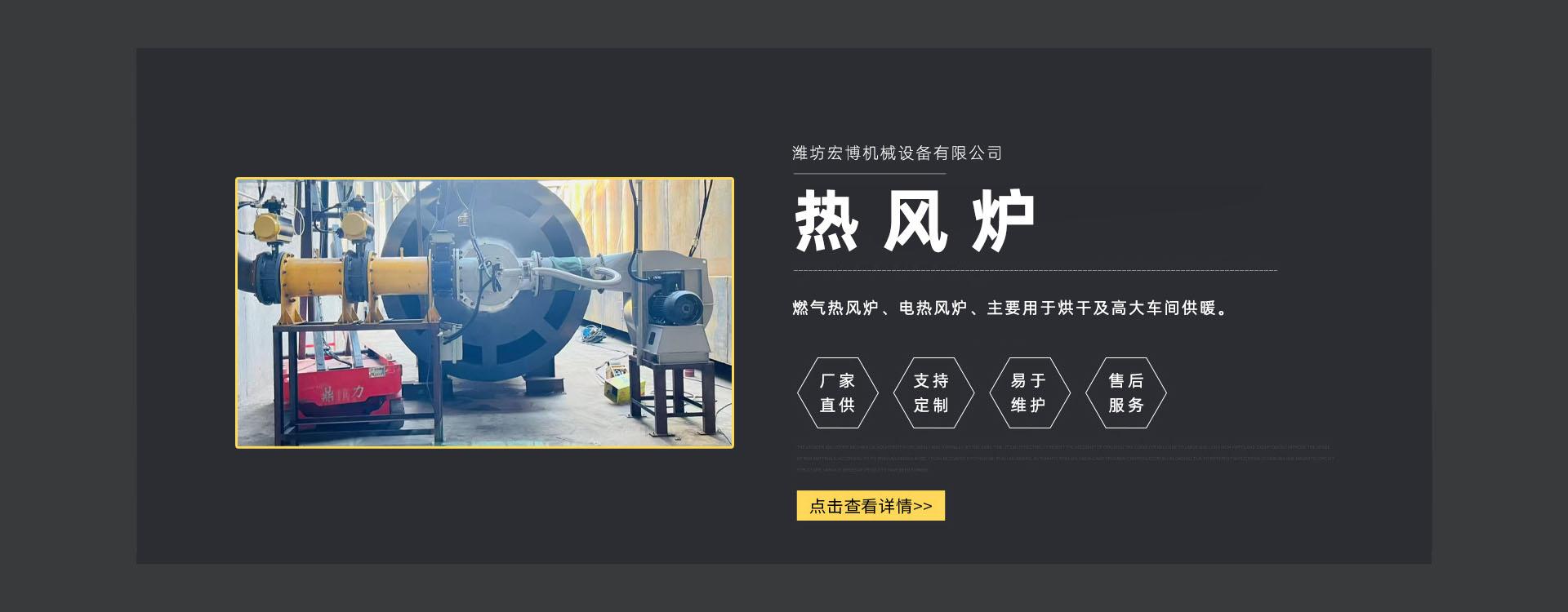 濰坊宏博機(jī)械設(shè)備有限公司是從事熱風(fēng)爐、烘干設(shè)備、供暖設(shè)備的研發(fā)、設(shè)計(jì)、制造和服務(wù)于一體的實(shí)體企業(yè)。長期以來,企業(yè)以市場的發(fā)展和客戶的需求為導(dǎo)向,集多年的生產(chǎn)技術(shù)與經(jīng)驗(yàn)為一體,不斷開發(fā)和優(yōu)良產(chǎn)品。